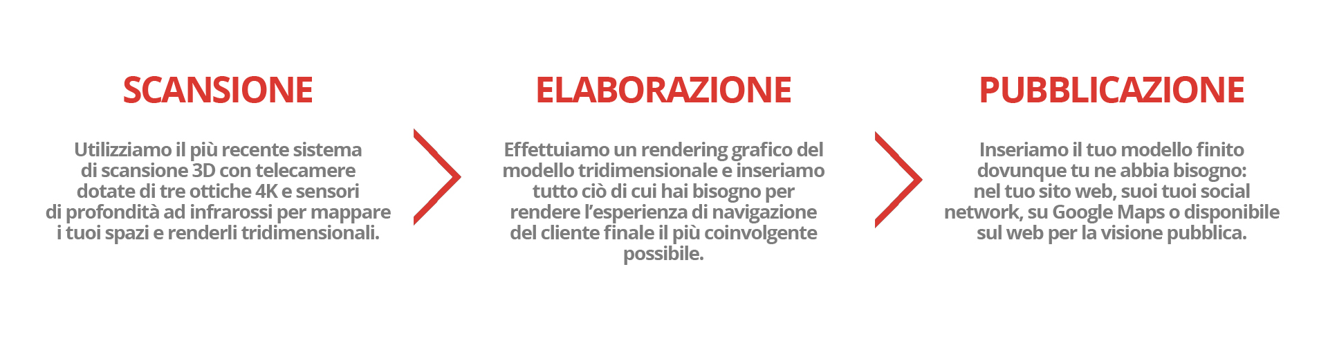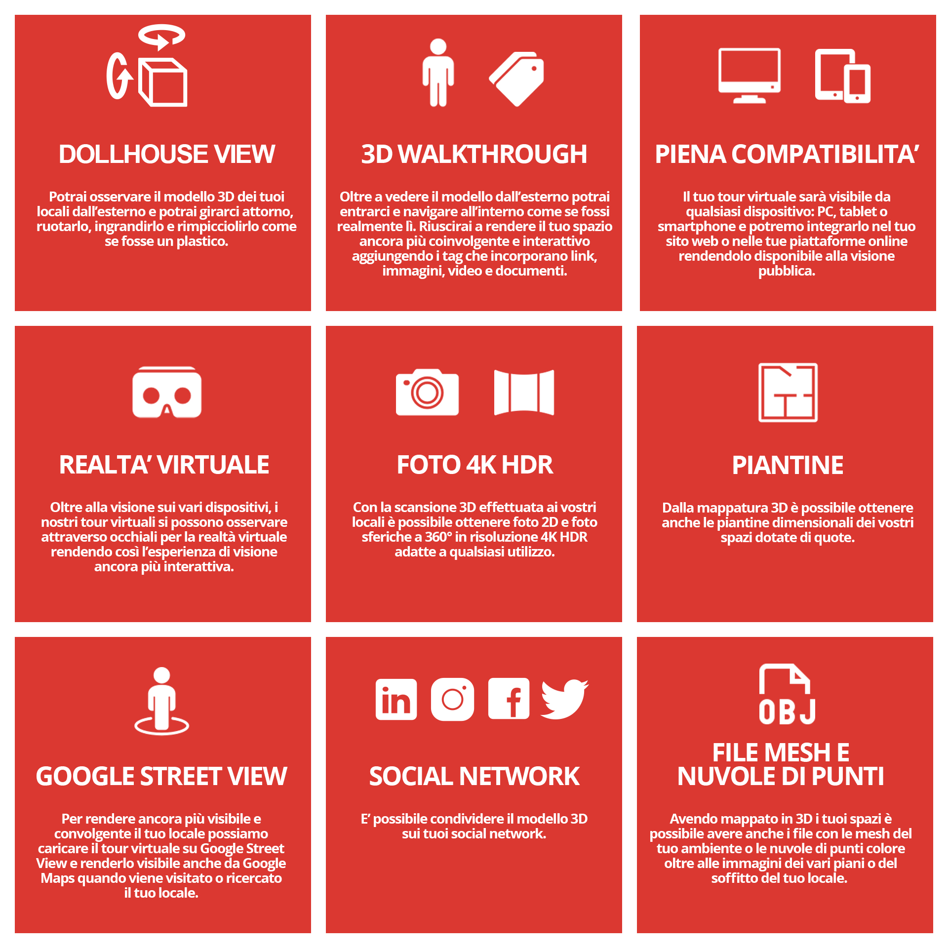 Attraverso le più recenti tecnologie di scansione tridimensionale possiamo ricostruire il tuo locale catturando ogni minimo dettaglio. Il risultato del processo di scansione sarà poter visualizzare, ruotare, ingrandire o addirittura camminarci all'interno da un qualsiasi PC, smartphone o tablet come se il tuo locale fosse un plastico. Si tratta di un'innovativa tecnologia che riesce ad andare oltre alle semplici fotografie 2D o sferiche e riesce a catapultare il cliente in un'altra dimensione.