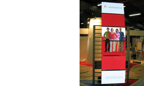 Colonna videowall composta da moduli plasma seamless con immagini sincronizzate.